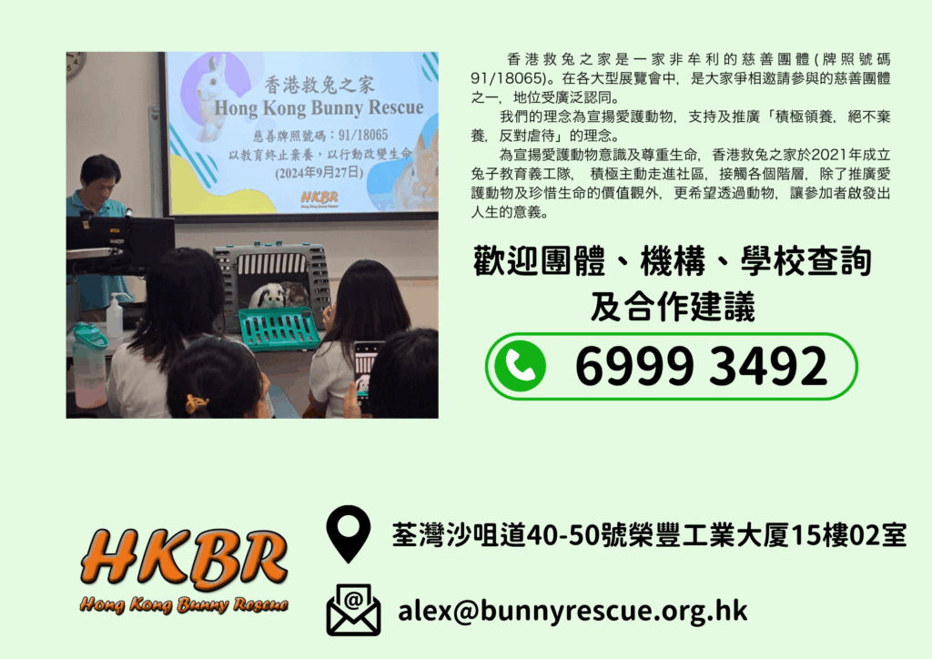 一直以來,香港救兔之家走遍港九新界,各大、中、小學、幼稚園及社區中心,為一眾市民服務,並推廣愛護動物、尊重生命的信息。